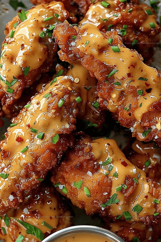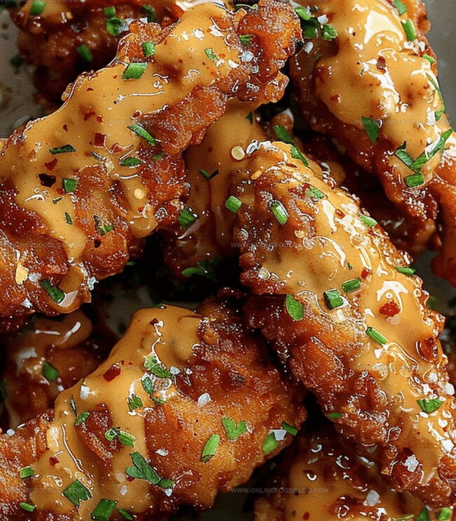 Finishing Touches: Transfer fried chicken to paper towels to drain excess oil, then generously coat with prepared bang bang sauce. Sprinkle freshly chopped parsley over the tenders for added color and flavor before serving immediately.