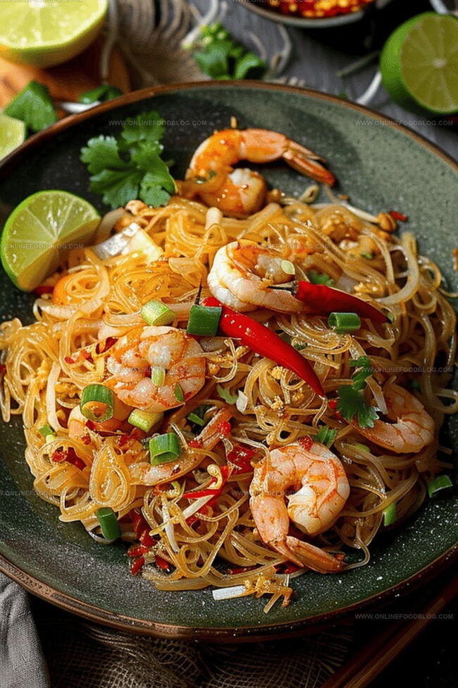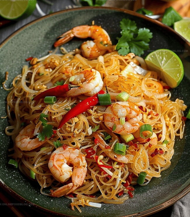 - Plate the mee siam, garnish with omelette strips, chopped spring onions, sliced red chillies, and a wedge of lime for a vibrant, tangy finish.