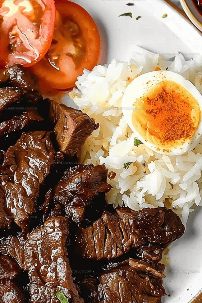 Serving Style Plate alongside fluffy garlic fried rice and a perfectly sunny-side-up egg, creating the classic Filipino breakfast combination known as tapsilog.