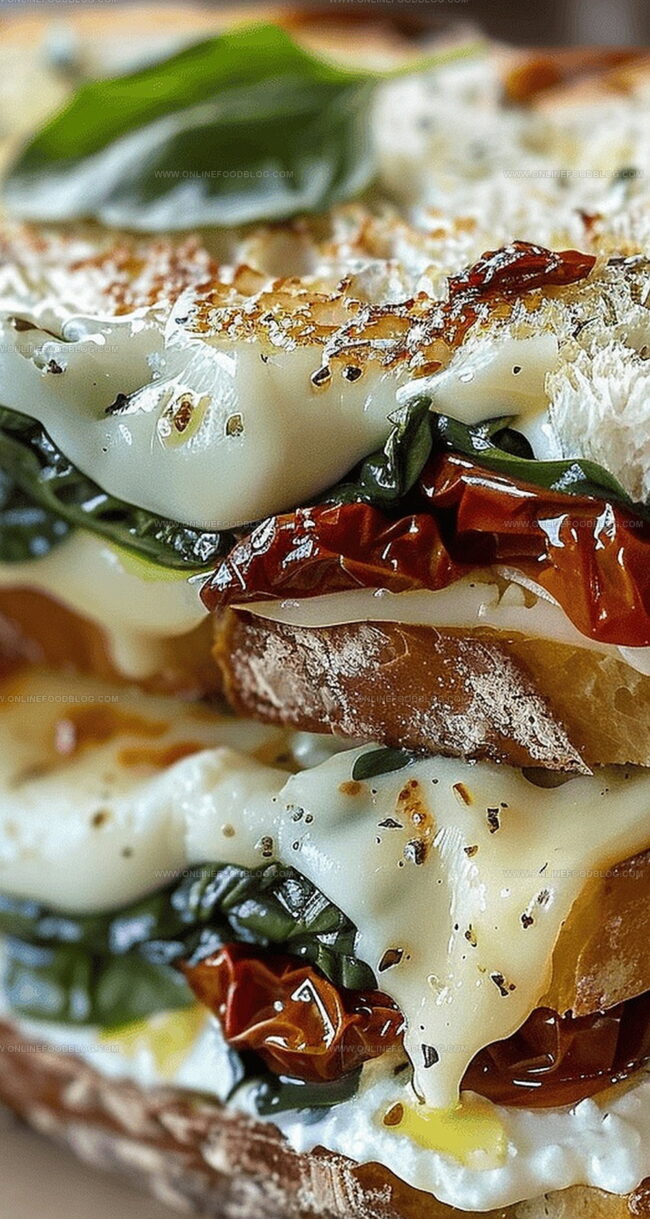 Savory sun-dried tomato, spinach, and ricotta toasted sandwiches offer Mediterranean flavors in a quick lunch. Melted cheese, tangy tomatoes, and fresh spinach combine effortlessly, bringing gourmet comfort to your midday meal.