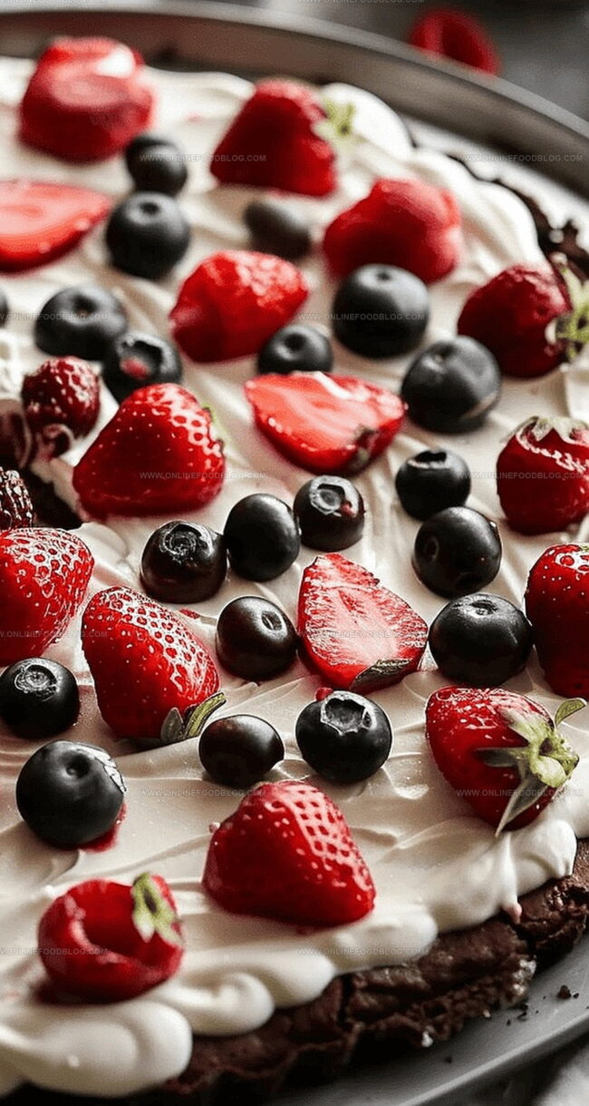 Sweet chocolate base combines homemade berry brownie pizza with creamy mascarpone frosting and fresh seasonal berries. Chocolate lovers will savor this delightful dessert that balances rich cocoa with tangy fruit notes.