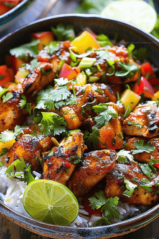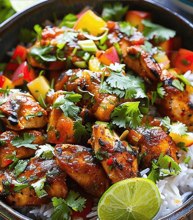 Fluffy white rice becomes the canvas for this colorful meal. Pile on the sparkling salsa, crown with glistening chicken, and scatter fresh cilantro for a final flourish. Lime wedges invite an extra splash of sunshine.