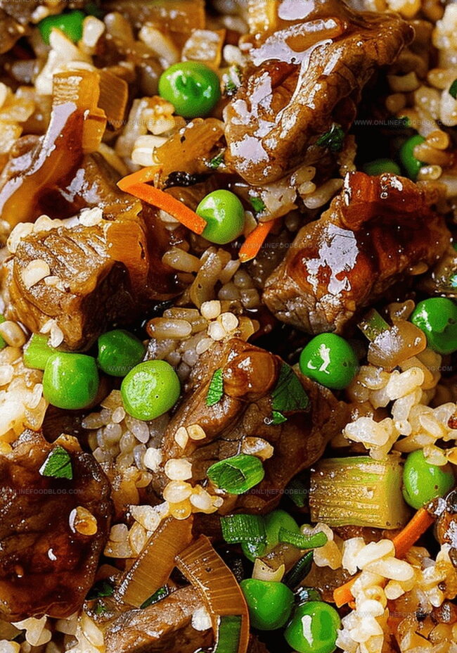 Tender beef chunks swim in a rich, glossy sauce that promises instant satisfaction.