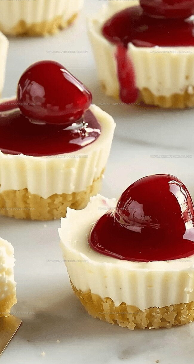 - Finishing Touches: Carefully remove cheesecakes from muffin tin, optionally peeling away paper liners. Embellish each mini cheesecake with a generous spoonful of cherry pie filling or create a glossy topping by combining cherry jam with warm water for an elegant presentation.