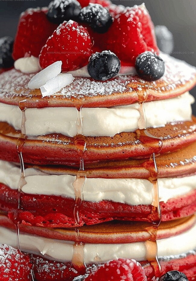 Classic southern red velvet pancakes combine cocoa-infused batter with cream cheese glaze, offering rich crimson color and luxurious flavor. Breakfast lovers will discover a delightful morning indulgence perfect for special occasions.