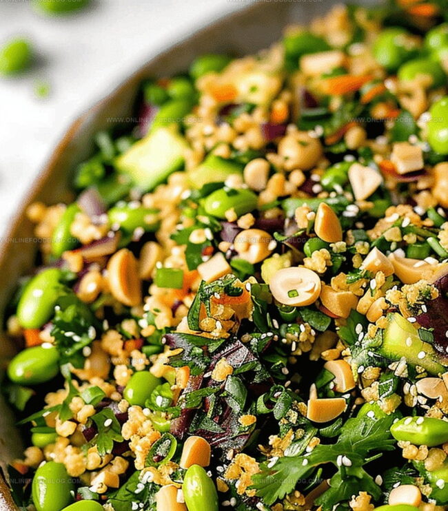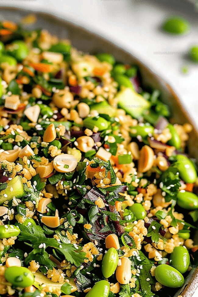Memorable fusion of flavors emerges in this Asian edamame peanut crunch salad with crisp vegetables and zesty dressing. Nutty peanuts and fresh ingredients create a refreshing meal that delights palates and satisfies hunger.