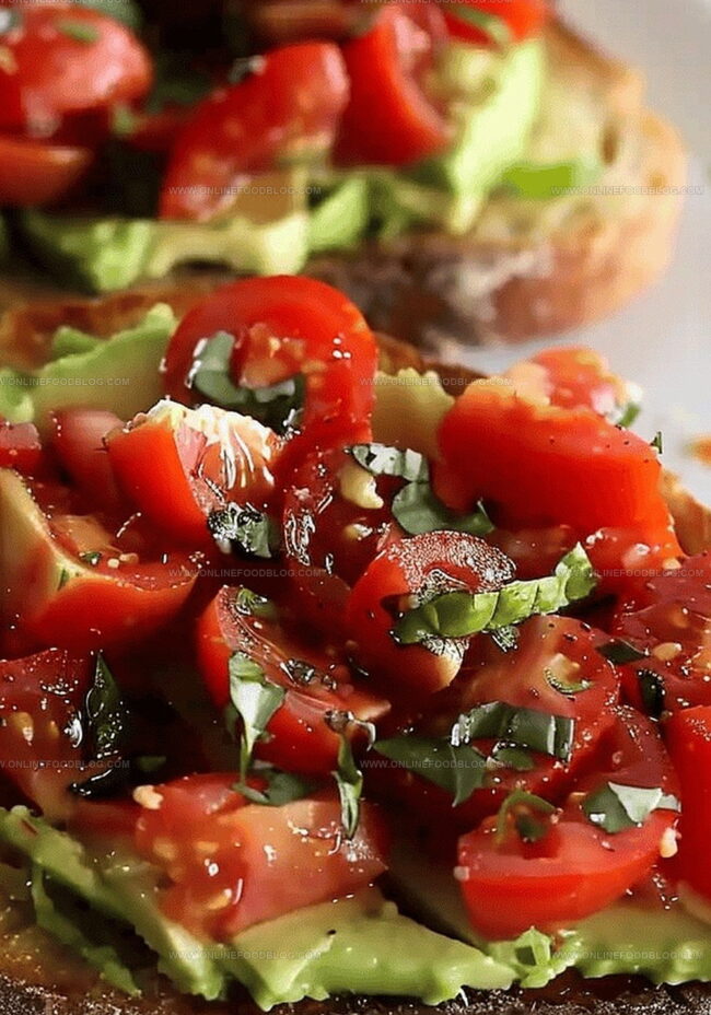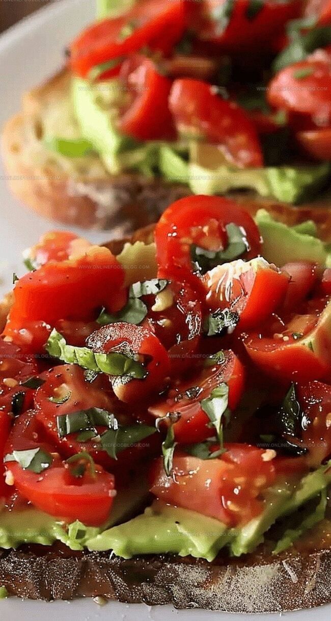 - Final Composition: Artfully spoon the prepared bruschetta mixture over the avocado layer, ensuring an even distribution. Complete the dish with an elegant drizzle of balsamic glaze, adding a glossy, sweet-tangy dimension that elevates the entire culinary creation.