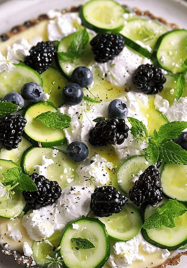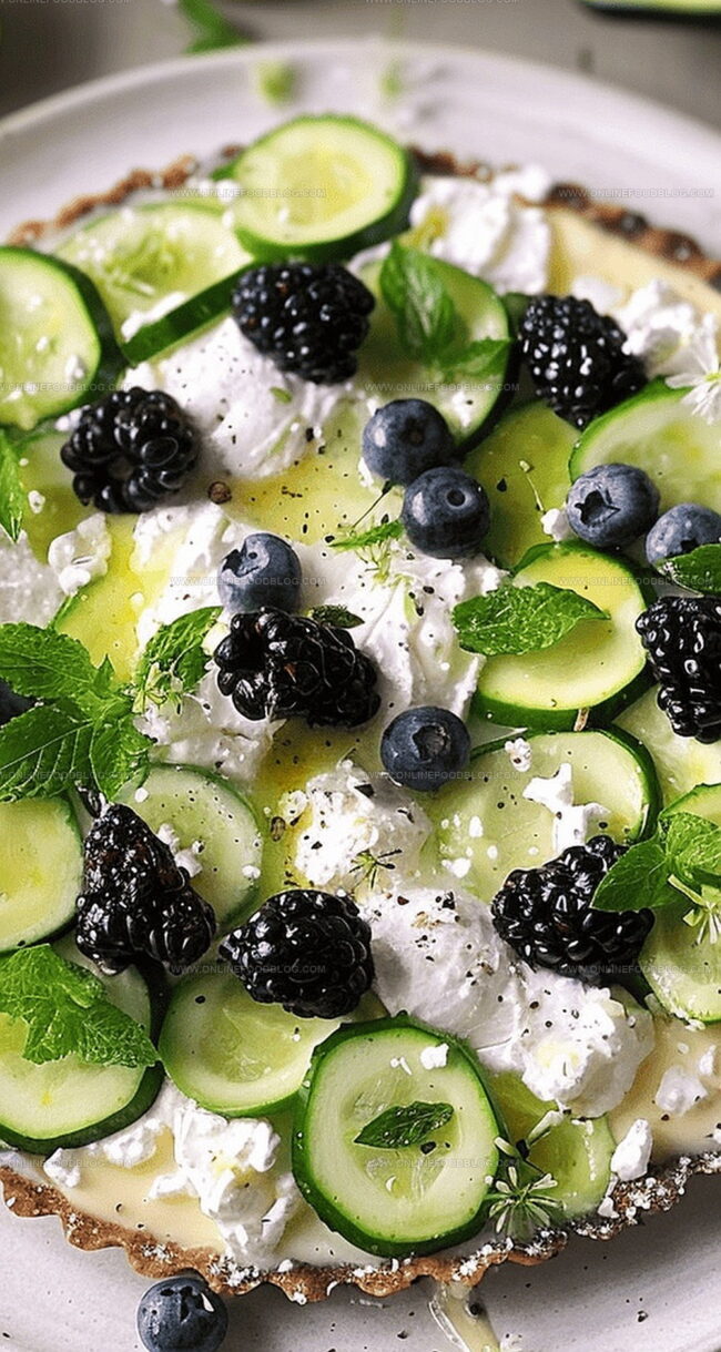 - Layer Components: Strategically distribute cucumber medallions, blueberries, avocado slices, blackberries, and crumbled feta cheese atop the arugula, creating a visually stunning landscape of colors and textures.