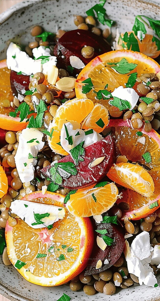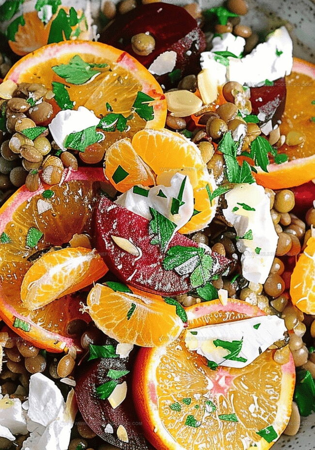 Mediterranean-inspired lentil salad blends roasted beets and blood oranges in a zesty dish. Crimson vegetables and citrus create balanced flavors that complement earthy lentils, inviting you to savor each refreshing bite.