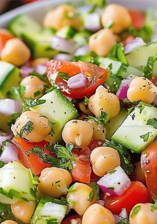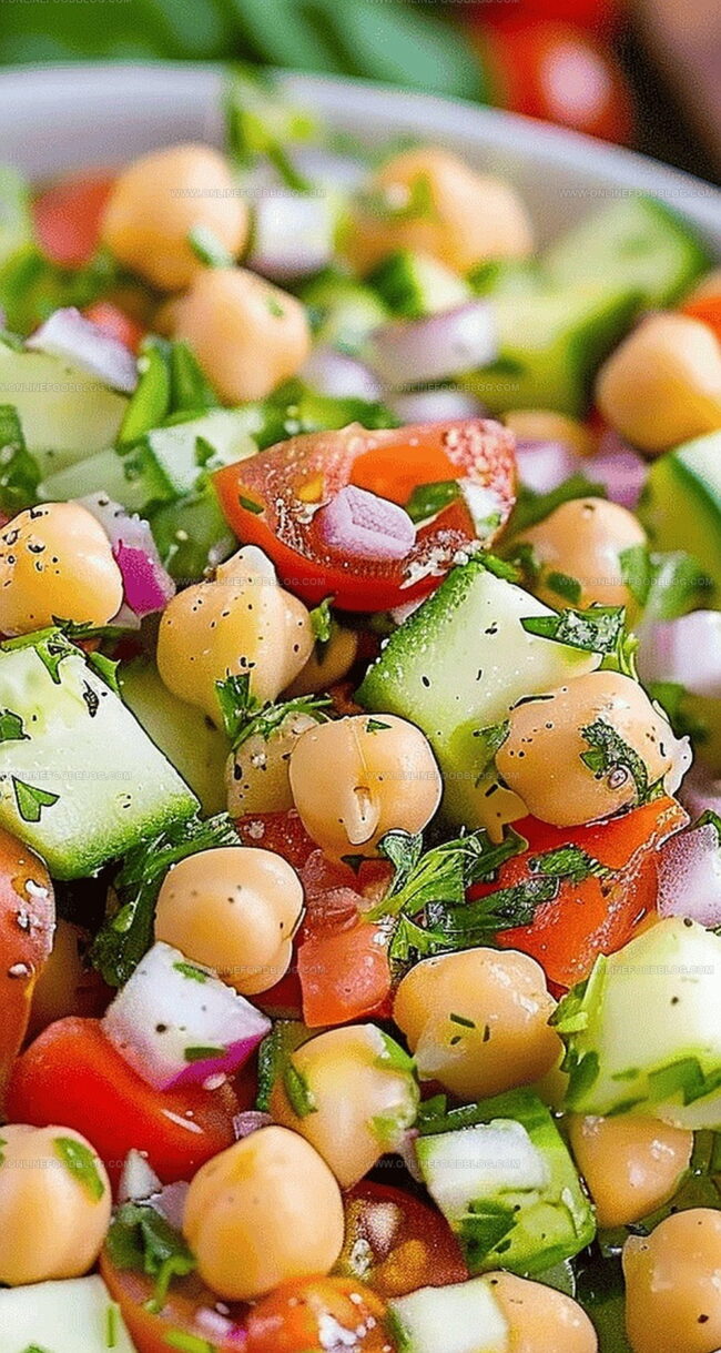 Chop crisp tomatoes, cool cucumber, and vibrant red onion into bite-sized pieces. Toss these fresh ingredients with protein-packed chickpeas and creamy avocado chunks.