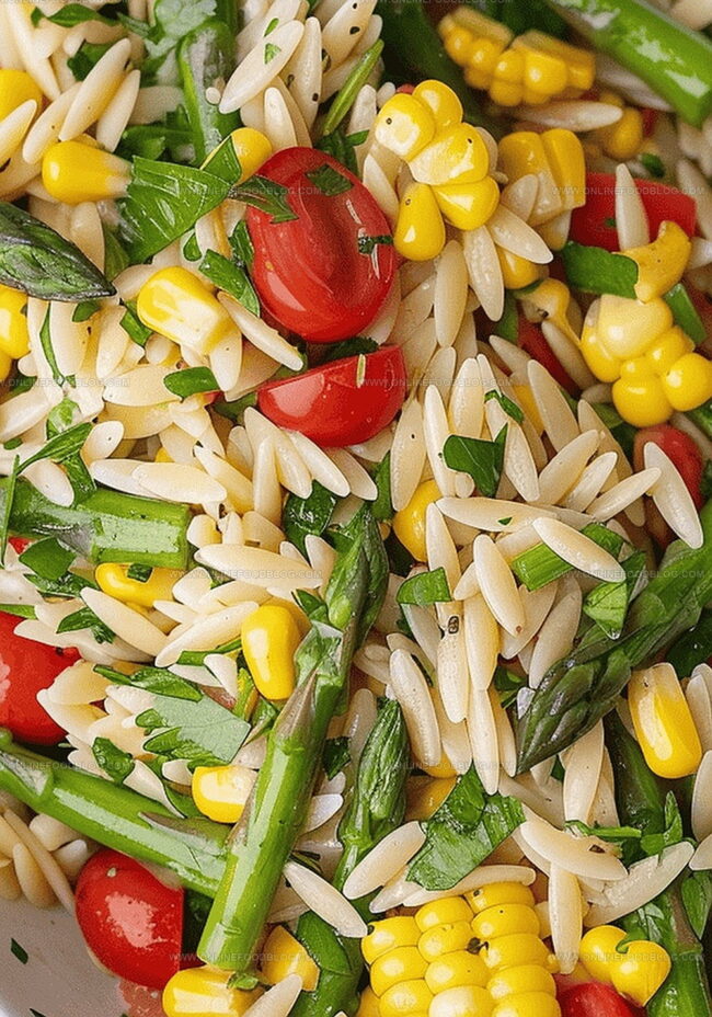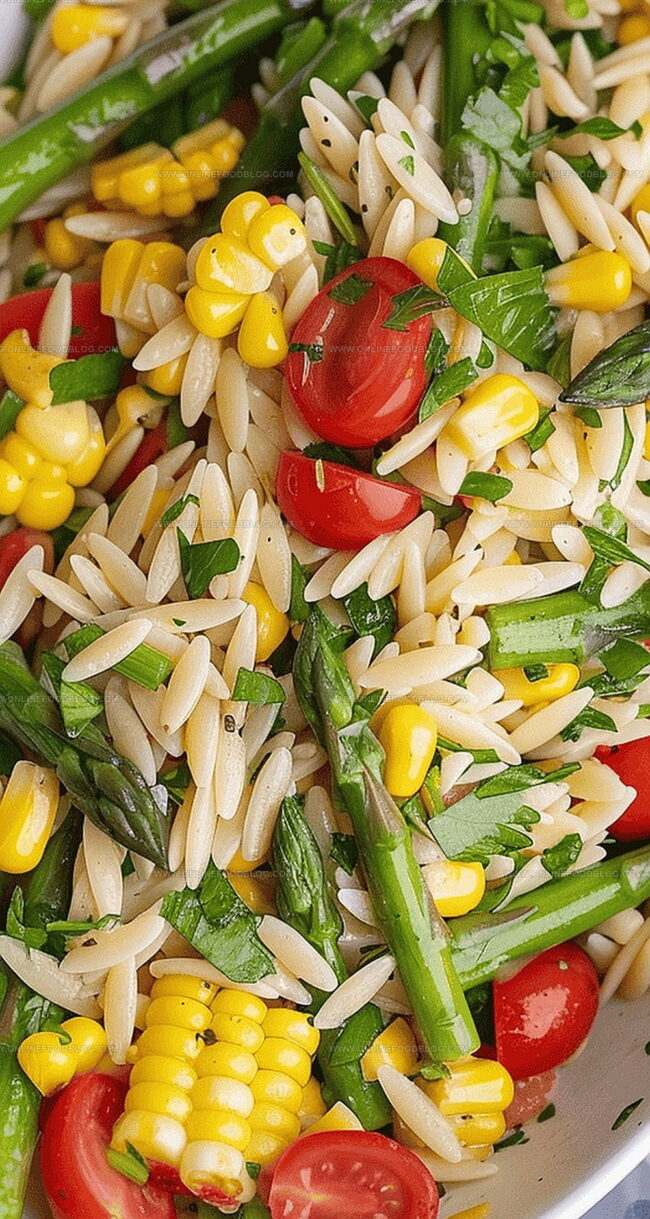 - Salad Assembly: Combine cooked orzo, roasted asparagus, charred corn, and tomatoes in a mixing bowl. Pour prepared vinaigrette over the mixture, gently tossing to ensure even coating. Season with additional salt and pepper to enhance flavor complexity.