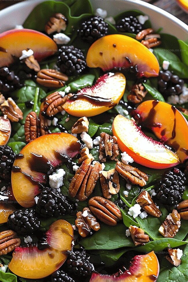 Artfully arrange fresh spinach leaves as a vibrant green foundation. Top with juicy peach slices, bursting blackberries, and crunchy toasted pecans. Crumble tangy feta cheese over the colorful medley.